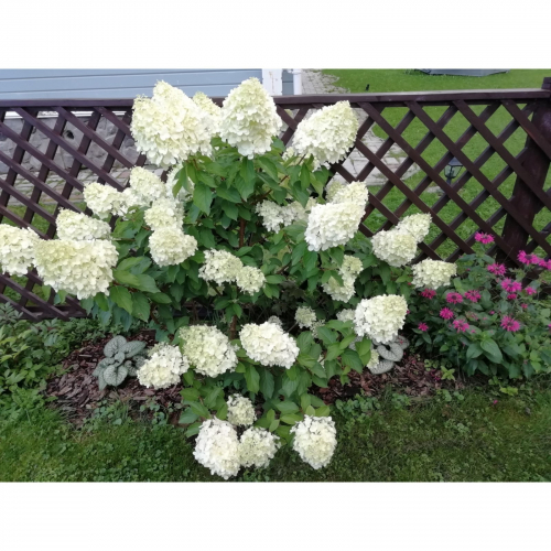 цветки белоснежные, в конце лета розовые, соцветия очень крупные до 40 см Гортензия метельчатая сорт Геркулес — это мощный и эффектный декоративный кустарник, который станет ярким акцентом любого сада. Крупные конические соцветия состоят из множества плотных белых цветков, постепенно приобретая нежно-розовый оттенок по мере цветения, создавая впечатляющий декоративный эффект. Листья зелёные, овальной формы, с заострённой вершиной и слегка зубчатым краем, формируют густую и аккуратную крону. Сорт отличается крепкими побегами, обильным и продолжительным цветением, высокой зимостойкостью и устойчивостью к неблагоприятным погодным условиям.