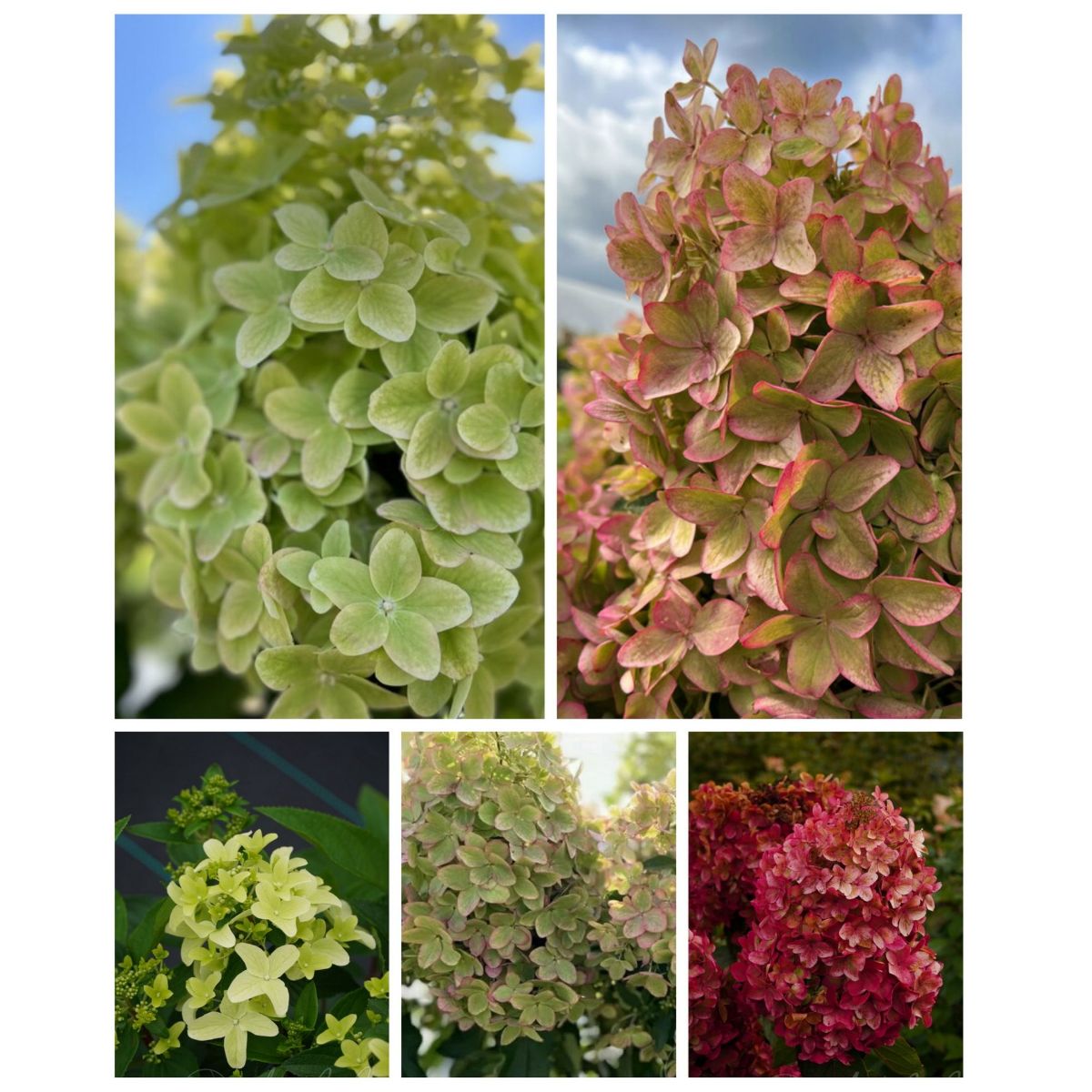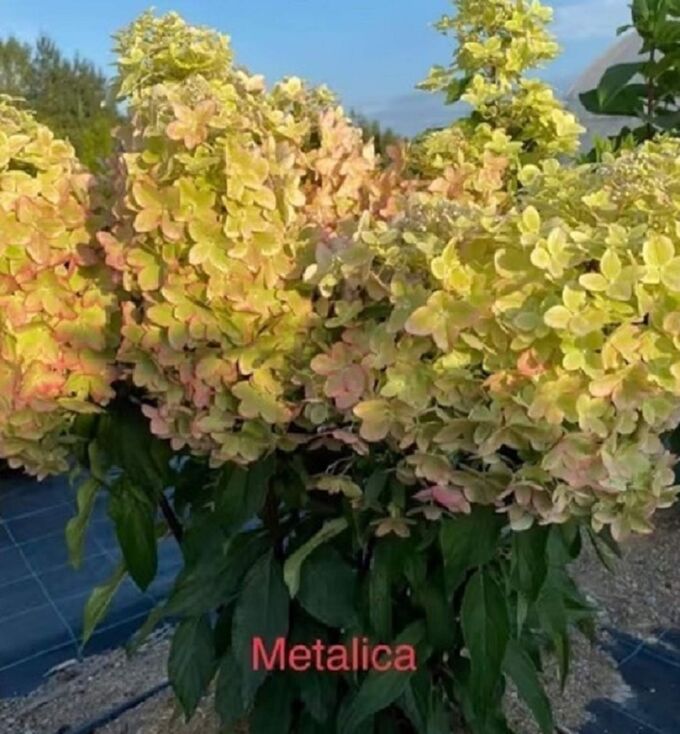 цветки в начале лаймово-белые, затем появляется розовая кайма и в конце становятся малино-бордового цвета, соцветия 50 см