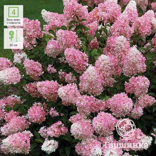 Высота куста не превышает 80 см.,диаметр 1 м. Растение цветет в год посадки, распускается белыми цветами, которые позже розовеют, получается оригинальный перелив оттенков. Соцветия гармонируют с изумрудно-зеленой листвой, формируя целостную композицию. Именно поэтому растение эффектно смотрится в одиночных посадках. Высаживают гортензию в легкой полутени, вдоль бордюров, стен, заборов. Цветет все лето, с первых дней июня до середины сентября. Морозостойкость высокая, первый год после посадки требуется укрытие на зиму.