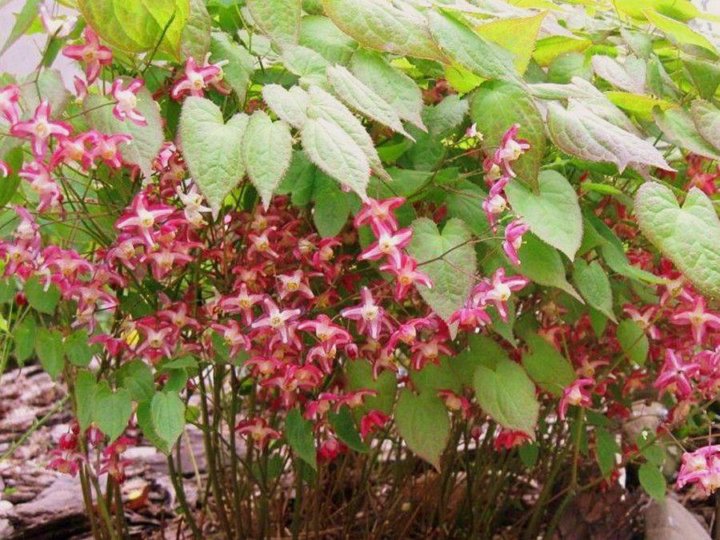 Гибрид горянки крупноцветковой и альпийской. Растения высотой до 35-40 см. Отличается высоким и плотным надпочвенным покровом. Очень красивы молодые листочки. Они пурпурные по краю и вдоль жилок. Цветки до 1,5 см, красные с желтым.