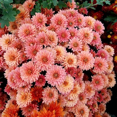 Шарообразная форма куста от 30 до 50 см высотой и до 1м в диаметре. Стебли сильноветвистые, крепкие, густооблиственные. Хризантема быстро разрастается, поэтому каждые 3 года куст желательно делить.Листья очень похожи на дубовые листочки, темно–зеленые, с изрезанным краем, очертания округлые. Цветок диаметром 4–7 см, махровый, лососево–красноватого цвета. Бутоны распускаются настолько плотно друг к другу, что стеблей и листвы практически не видно. Цветение наступает с конца августа–сентября и длится до самых заморозков.