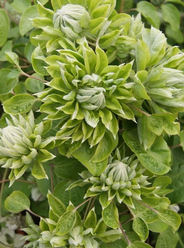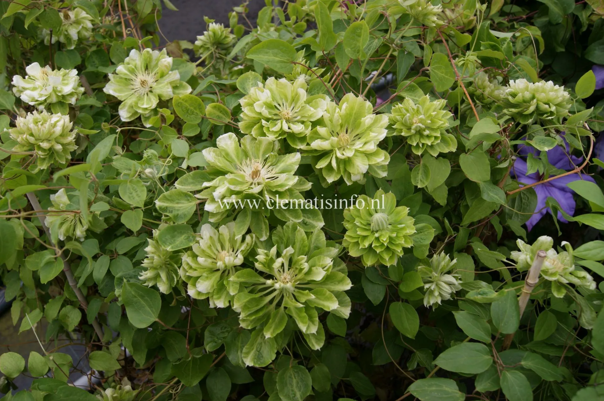 Новый необыкновенныйсорт с постоянно-махровыми зелеными цветками, цветки большие, чашелистики разноокрашенные: от зеленых, бело-зеленых до чисто белых. Цветет за сезон два раза. Обильное и длительное цветение весной-летом, осеннее - менее интенсивное. Прекрасный сорт для невысоких садовых опор ( 2 м), хорошо смотрится среди различных кустарников, можно выращивать в контейнере.