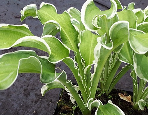 Волнистые, сильно закрученные зеленые листья с крупной бело-желтой каймой.