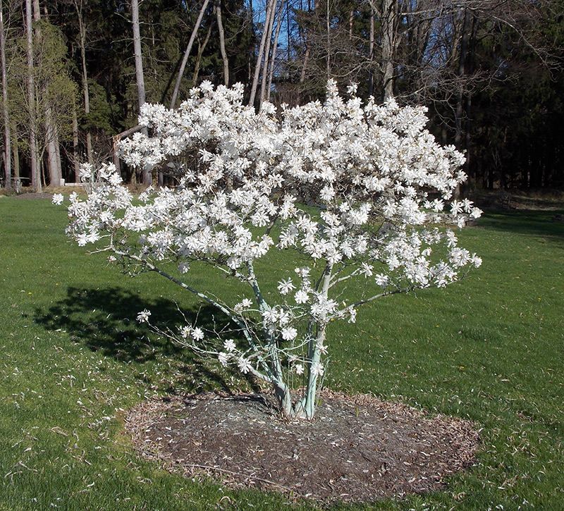 цветки звездчатые, белые, ароматные Магнолия звездчатая сорт Джордж Роял Стар — это изящное декоративное дерево с ароматными цветками, которое станет украшением любого сада. Крупные звёздчатые цветки белого цвета с лёгким кремовым оттенком распускаются ранней весной, создавая нежный и утончённый декоративный эффект. Листья зелёные, овальной формы, с заострённой вершиной и гладким краем, формируют аккуратную и густую крону. Сорт отличается компактной формой, обильным и продолжительным цветением, высокой декоративностью и хорошей зимостойкостью.