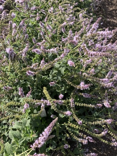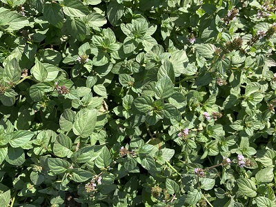 разновидность мяты с нежно-зелёными листьями и ароматом мандарина, побеги стелющиеся, листья зелёные, цветы светло-сиреневые
