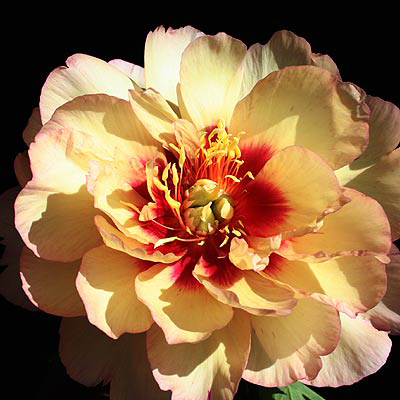 Срок цветения средний. Цветы кремово-желтые, махровые и полумахровые, по форме напоминают кувшинки водной лилии. Лепестки загнуты внутрь, что придаёт цветам очаровательный необычный вид. Диаметр цветка 13 см. Стебли прочные, листья узкие и длинные. Куст жизнестойкий, быстро нарастает, сохраняет декоративность при любых погодных условиях.