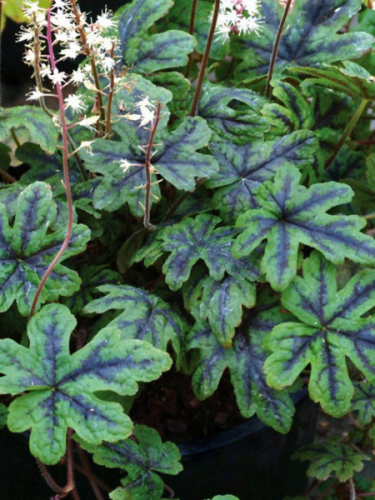 Очень редкая, ампельная тиарелла, образуюшая многочисленные гирлянды ярких, контрастных листьев. Многолетнее травянистое растение. Куст компактный, высотой 10-15см, побеги темно-красного цвета могут достигать 90см в длину. Разрастается быстро. У тиареллы Хеппи Трейлз – листья плотные, округлой формы, глубокоизрезанные, ярко-зеленые с черно-фиолетовой серединой и прожилками. Цветочки мелкие, звездчатые, белые, ароматные собранные в небольшие, метельчатые соцветия на цветоносах до 15см высотой. Цветение в мае-июле. Happy Trails используется для декора стен или для подвесного контейнера, прекрасно зарекомендовала себя как почвопокровный многолетник для тенистых мест. Отличное, мощное почвопокровное растение.
