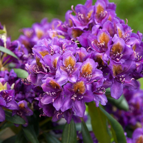 цветки белые с бледно-фиолетовым и коричневым пятном на верхнем лепестке Рододендрон «Каннингемс Уайт» — это вечнозеленый раскидистый кустарник, достигающий 2 м в высоту и 1,5 м в ширину, с крупными темно-зелеными кожистыми листьями. Он цветет обильно в начале июня белыми цветками (диаметром до 5 см), собранными в соцветия по 7–8 штук, с бледно-фиолетовым и коричневым крапом на верхнем лепестке. Этот сорт морозостойкий, неприхотливый, устойчивый к городскому загрязнению и требующий слабозатененного, защищенного от ветра места с кислой, рыхлой, хорошо дренированной почвой