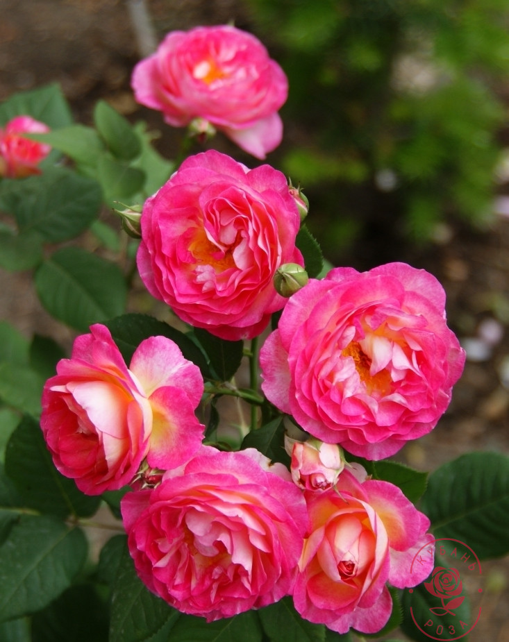 Розовые цветки с белой изнанкой лепестков. Аромат насыщенный. Цветение обильное, как у флорибунды. Цветки округлые, густомахровые, часто квартированные. Матовая темно-зеленая листва подчеркивает окраску цветков.
