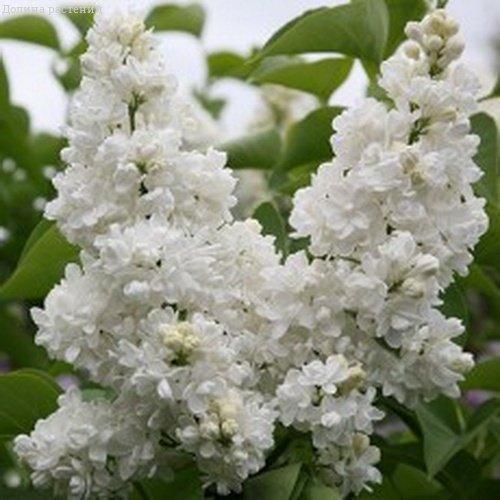 Белая сирень. Махровая. Соцветия широко-пирамидальные. Куст средней высоты, компактный. Цветение обильное, продолжительное. Срок цветения средний.
