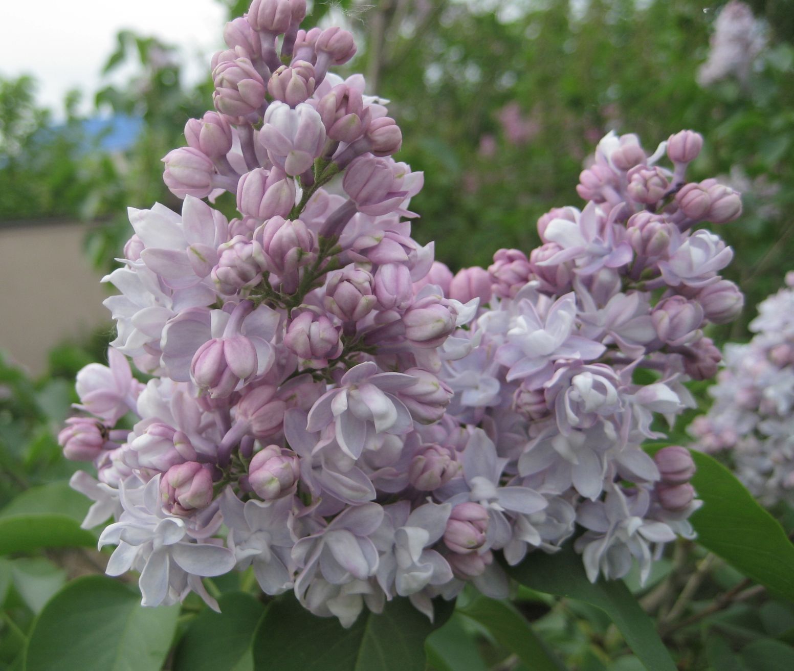 цветки почти белые с голубым и розовым отливом, махровые Сирень обыкновенная сорт Полина Осипенко — это декоративный кустарник с эффектными и ароматными соцветиями, который станет ярким украшением любого сада. Крупные кисти густых светло-фиолетовых цветков создают нежный и выразительный декоративный эффект в период цветения. Листья зелёные, сердцевидной формы с заострённой вершиной и гладким краем, формируют плотную и аккуратную крону. Сорт отличается обильным и продолжительным цветением, сильным ароматом, компактной формой куста и хорошей зимостойкостью.