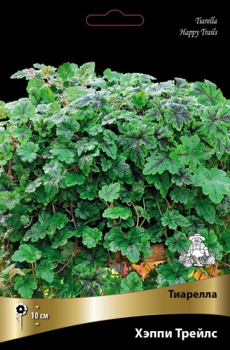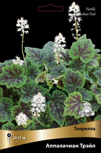 Ампельная тиарелла. Длинные побеги, достигающие 90 см, образуют гирлянду ярко-зеленых листьев с пурпурно-черной серединкой. Цветки белые, ароматные.