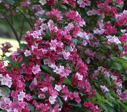 Вейгела Марджори (Weigela florida Marjorie) - Быстрорастущий сорт. Растение в высоту может достигать примерно полутора метров, при этом выглядит очень аккуратно и красиво в период цветения. Листья зеленые, заостренной каплевидной формы. Цветет в мае-июне. Цветки огромные, диаметром 3-5 см, гораздо больше, чем у других сортов. Примечателен тем, что на кусте одновременно обильно цветут цветы белого, красного и нежно-розового цвета, трубчатой формы.