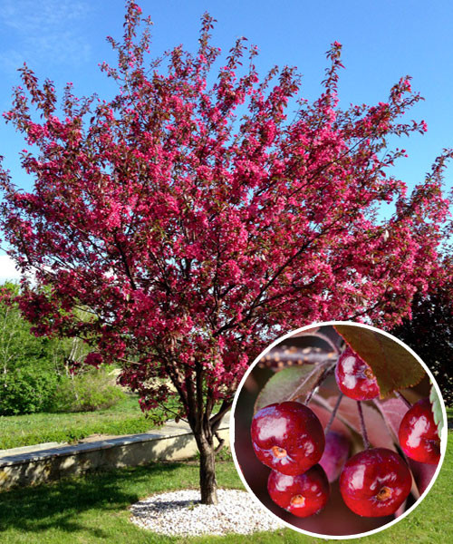 Листья суженные, с глянцевой поверхностью, опушенные, эллиптической или продолговато-яйцевидной формы, длиной до 8 — 12 см, очень красивого темно-фиолетового (пурпурного) окраса. К осеннему сезону листья становятся чуть более светлыми и приобретают насыщенный красный (багряный) окрас, не теряя при этом своей декоративности.Цветение у яблони Роялти очень обильное, начинается в начале мая и длится около 2-х недель (т. е. до середины месяца). В этот период деревья буквально завораживают своей необычайной красотой.Цветки многочисленные, крупного размера (в диаметре 2,5 — 3,5 см), необычайно ароматные, рубинового или малиново-красного цвета.Плоды НЕСЪЕДОБНЫ.