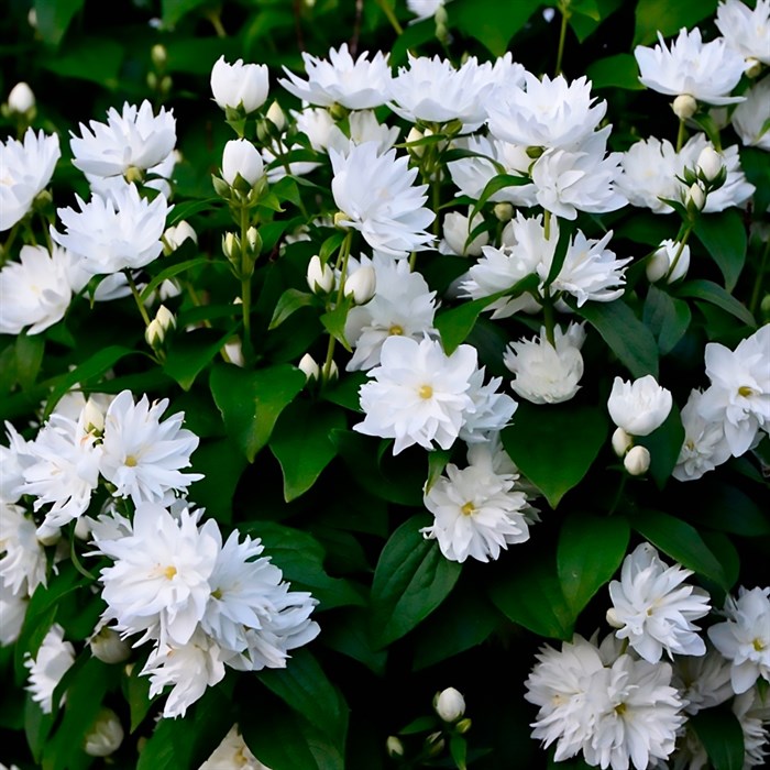 цветки кремово-белые, махровые, ароматные Жасмин садовый сорт Джирандоль — это изысканный декоративный кустарник с крупными и ароматными цветками, который станет украшением любого сада. Белоснежные цветки с лёгким кремовым оттенком собраны в аккуратные соцветия, создавая эффектный и утончённый декоративный акцент. Листья тёмно-зелёные, овальной формы, с заострённой вершиной и гладким краем, формируют густую и аккуратную крону. Сорт отличается обильным и продолжительным цветением, приятным ароматом, компактной формой куста и высокой зимостойкостью.