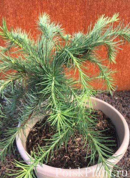 Кустарник нерегулярной формы со слегка изогнутыми побегами, растёт медленно до высоты 100-150 см. В молодом возрасте куст образует один или несколько проводников. Иногда один из проводников может начать обгонять в росте другие проводники и тогда куст принимает столбчатую форму. Боковые побеги отрастают от проводников и растут вертикально вверх, но медленно (4-5 см в год). Молодые побеги красно-бурые. Хвоя короткая, длиной до 2 см, изогнутая, зелёная с лёгким голубоватым оттенком, густо расположена на побегах. Шишек не образует. Место солнечное. Почва плодородная, умеренно влажная, дренированная.