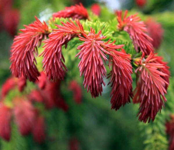 Декоративная карликовая форма ели с необычными красно-малиновыми приростами весной.