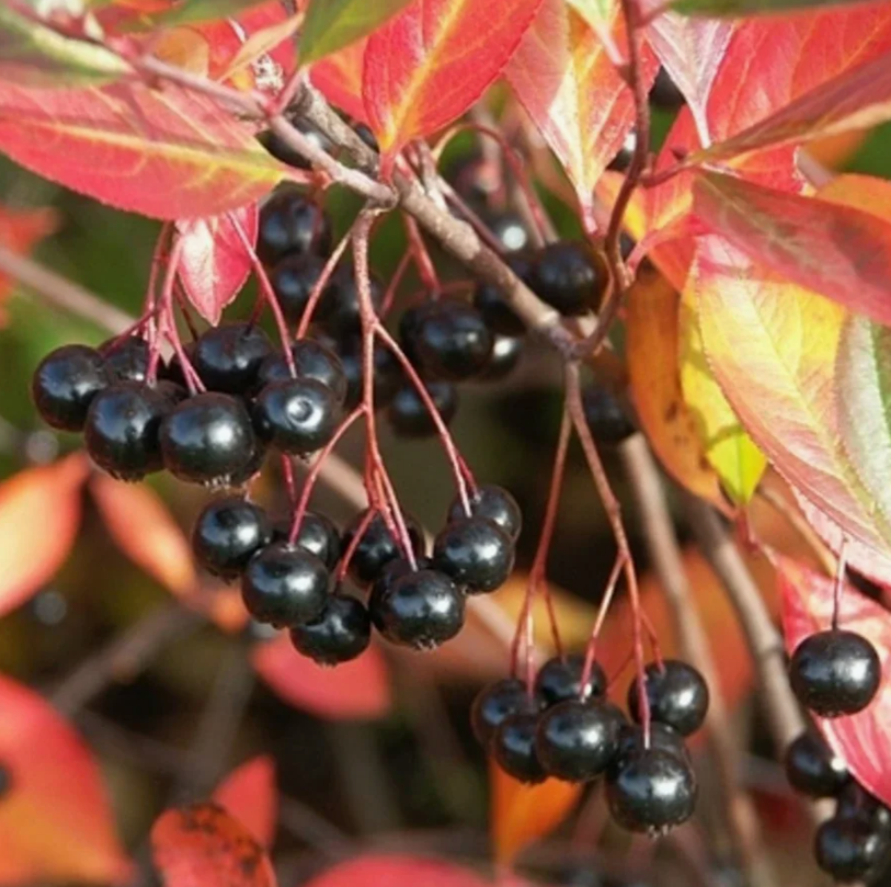 цветки белые, плоды черно-красные, куст компактный высотой 1-1,5 м