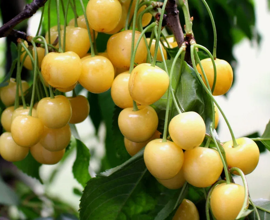 Сорт относится к сильнорослым культурам. В среднем высота дерева варьируется в диапазоне 3-4 м, а максимальная высота составляет 5-6 м. Крона практически не загущена. Её форма шарообразная или конусообразная, верхушка слегка приплюснута. Ягоды по размеру чуть выше среднего, по массе 8 г. Форма плодов округлая, сердцевидная, что делает внешний вид ещё более ярким и эффектным. Окрас недоспевших ягод бледно-желтый, спелых – насыщенно-желтый. Мякоть плотная, мясистая и очень сочная (цвет выделяемого сока – прозрачный). Оттенок её желто-соломенный. Внутри вдоль стенок присутствуют едва заметные прожилки. Отмечается очень сладкий вкус культуры. Плодоносить черешня начинает на 4 год после высадки в открытый грунт. Морозостойкость до -35. июль Наполеон, Францис, Крупноплодная 4 1,5-1,8