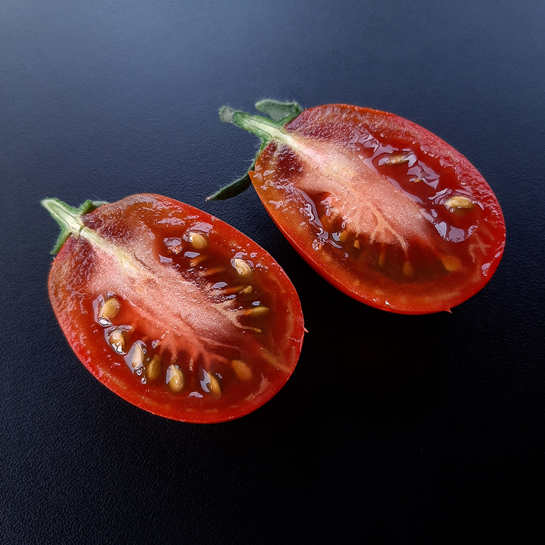 Мякоть томата Черный дракон умеренно сочная, мясистая и плотная, кожица не растрескивается, прочная и глянцевая.