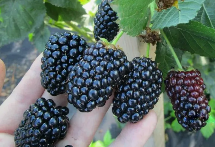 Компактный сорт, куст вертикальный. Побеги без шипов, высотой до 1,5-2 м., что существенно облегчает уход за растением и сбор урожая. Листья светло-зелёные, цветки – белые. Плоды овальные, крупные – средний вес 6-8 гр. Отдельные ягоды могут достигать 20-25 граммов. Цвет спелой ежевики черный с глянцевым блеском. Мякоть – нежная, сочная. Вкус – десертный. Урожайность сорта — 5-7 кг ежевики с куста, что считается хорошим показателем для «тутаймера». Плодоношение – непрерывное, вплоть до первых холодов. Первая волна ягод созревает в июне на побегах второго года, вторая – в августе на первогодках. июнь самоплодное 2-3 0,5-0,8 м