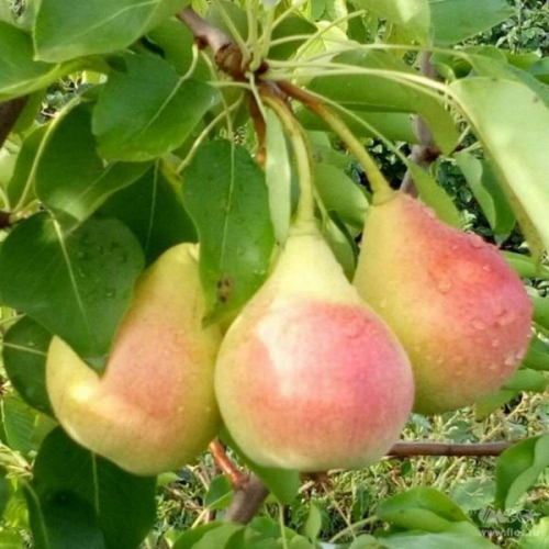 Груша Красавица Черненко (Русская красавица) – это сорт груши, известный своими крупными и привлекательными плодами, что и определило его название. Он отлично подходит как для дачных участков, так и для промышленного возделывания. Дерево имеет мощный рост, достигая высоты от 5 до 6 метров, с гладкой коричневой корой и узкой, разреженной пирамидальной кроной. Плоды крупные, весом от 150 до 200 граммов, иногда достигают 300 граммов. Они имеют удлиненную конусообразную форму, бугристую поверхность и приятный аромат. На стадии съемной зрелости плоды окрашены в зеленоватый цвет с легким розоватым оттенком, а при полном созревании становятся желто – зелеными с ярким румянцем. Мякоть мягкая, матово – белая, сочная и тающая во рту. Кожура тонкая, с едва заметным восковым налетом. Семена темно – коричневые и продолговатые. Для транспортировки рекомендуется собирать плоды немного недозрелыми. Они обладают высоким товарным видом и могут храниться до 1,5 месяцев в прохладном темном месте. Вкус у них умеренно сладкий с легкой кислинкой. Созревание начинается в конце августа, и о зрелости свидетельствует пожелтение кожуры. Рекомендуется собирать плоды постепенно в течение 5 – 7 дней, проявляя осторожность из – за нежной кожи. Сорт отличается высокой урожайностью и является самоплодным, однако для повышения продуктивности желательно высаживать рядом опылители. Плоды подходят как для употребления в свежем виде, так и для консервирования, приготовления соков и десертов.