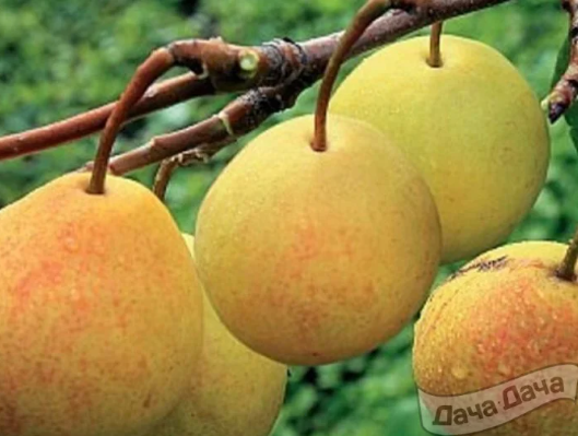 Плоды выше среднего размера (масса 151 г), бергамотообразной формы, слаборебристые. Кожица средней толщины. Основная окраска зрелых плодов светлая, желтовато-зеленая, покровная окраска отсутствует, или проявляется в виде небольшого румянца буровато-красного цвета. Подкожные точки крупные, средней численности. Плодоножка очень короткая или короткая, толстая. Воронка узкая, мелкая. Блюдце узкое, мелкое, иногда ребристое. Чашечка полуоткрытая.