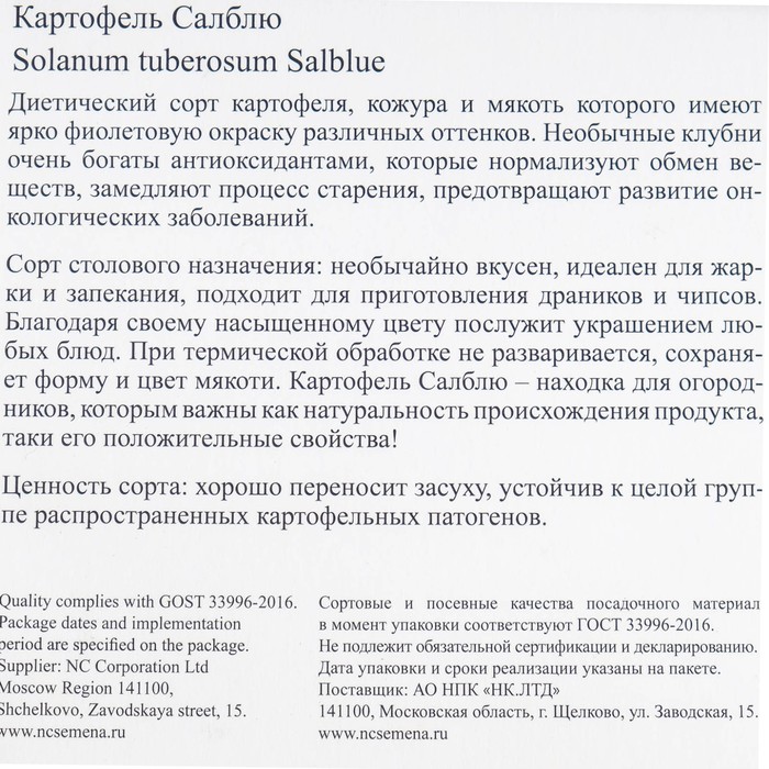 Семенной картофель «Салблю », фиолетовая мякоть, среднепоздний, Весна 2026