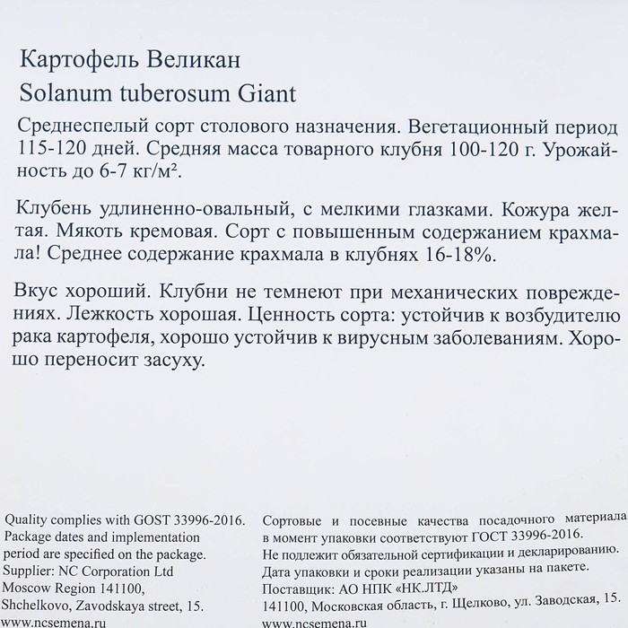 Семенной картофель «Великан», светло-жёлтая мякоть, среднеспелый, Весна 2026