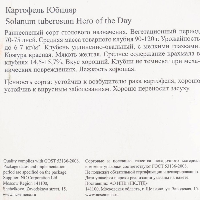 Семенной картофель «Юбиляр», жёлтая мякоть, среднеранний, Весна 2026