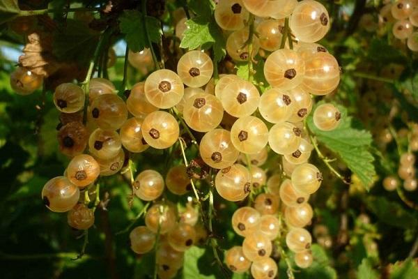 Плоды крупные до 10 мм и массой до 1,3 грамма. С куста при хорошей агротехнике можно собрать до 4 кг округлых ягод. Плоды с плотной, прозрачной кожицей нежно-кремового цвета и кисло-сладкой мякотью. Созревающие ягоды на белой Версальской смородине по описанию и отзывам садоводов прочно держатся на черешках и не осыпаются.