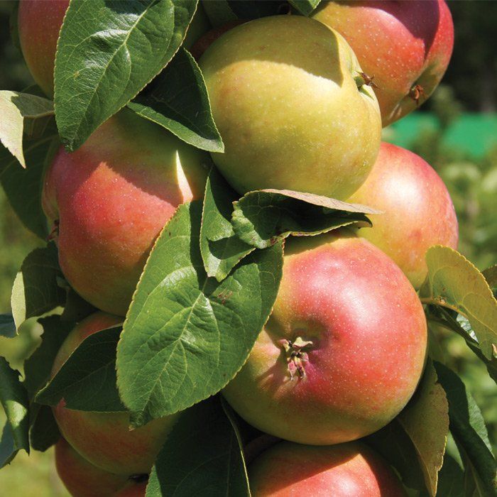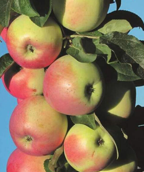 Яблоня колоновидная Зелёный Шум - позднеосенний зимостойкий сорт, устойчивый к парше! Очень красивое, компактное дерево с довольно крупными плодами зеленовато-желтой окраски с ярко выраженным малиновым румянцем. Мякоть плода плотная, мелкозернистая с кисло-сладким вкусом и тонким ароматом. С одного деревца можно собрать около десяти килограммов урожая. Плоды употребляются в свежем виде, пригодны для переработки, например, изготовления сухофруктов.