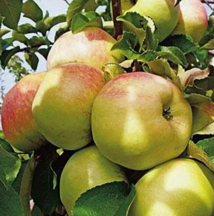 Яблоня сорта Богатырь отличается большой силой роста и достигает в высоту 4,5 м. Крона – шириной до 6 м. Дерево мощное с крепкими ветками, нижние ветви расположены почти параллельно земле. В плодоношение яблоня Богатырь вступает на 6 год после прививки, экземпляры, Особенность этого сорта яблони – на плодушках развивается до 3 плодов. Урожайность яблони сорта Богатырь не только постоянная, без периодичности, но и высокая. Размер плодов впечатляет и вполне оправдывает название сорта. Даже средний вес яблок колеблется в пределах от 150 до 200 г. Наиболее крупные экземпляры вырастают и до 400 г.Форма яблок типична для кальвилей. Они плоскоокруглые, имеют широкое основание и вершину, на них хорошо заметна ребристость. Оржавленность занимает не только всю воронку, но и часто выходит за ее пределы.Цвет плодов в съемной зрелости светло-зеленый, в процессе хранения они желтеют. В отдельные годы яблоки Богатырь бывают разукрашены красным покровным румянцем, обычно на стороне, больше освещенной солнцем. Конец сентября Спартан, Синап и Жигулевское 5-6 1,0-1,5 м