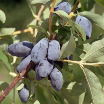 Эта разновидность жимолости относится к группе очень крупноплодных сортов. На взрослом кустарнике спеют ягодки массой до 4-х граммов и длиной до 3-х см. Форма плодов стандартная – удлиненно-овальная, с заостренными окончаниями. Спелая жимолость имеет красивый фиолетовый окрас, разбавленный выраженным сизым налетом. Кожура у ягоды умеренно-плотная, не жесткая, с заметной бугристостью поверхности.