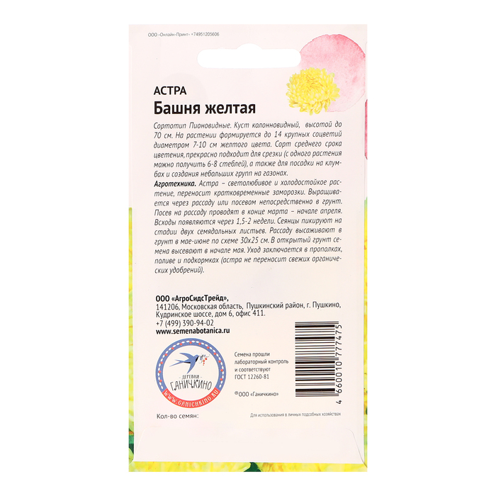 Семена цветов Астра "Башня Жёлтая", 0,3 г