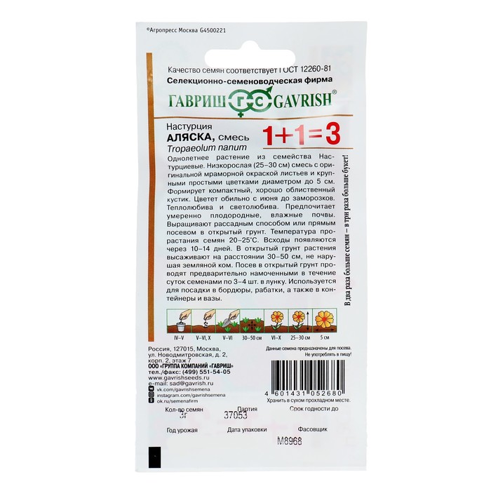 Семена цветов Настурция 1+1 "Аляска", ц/п, смесь 3,0 г