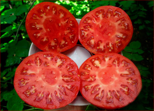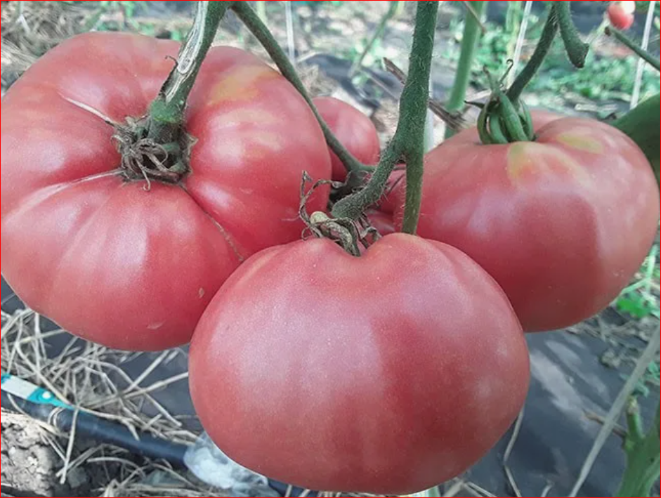 Плоды цветом ближе к малиновым, до 500 грамм. ????Вкус фруктовый с чудесным послевкусием и помидорным ароматом.
