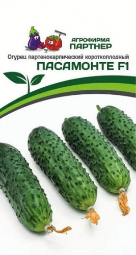 Гибрид Пасамонте среднеспелый. От всходов до начала плодоношения 43-45 дней. Плод генетически без горечи, цилиндрический, длиной 6-9 см, крупнобугорчатый, белошипый, зеленый с продольными полосами средней длины и средневыраженной пятнистостью, не перерастает. В одном узле формирует 2-3 плода. Вкусовые качества свежих и консервированных плодов отличные. Пригоден для засола и консервирования.Пасамонте F1 устойчив к кладоспориозу и мучнистой росе, относительно устойчив к вирусу огуречной мозаики-1 . Урожайность 12-15 кг/кв.м.