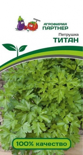 Среднеспелый сорт листовой петрушки. Период от полных всходов до начала технической спелости – 80-90 дней. Розетка листьев полувертикальная, мощная, лист темно-зеленый, мелко изрезанный, среднекурчавый. Масса одного растения 100 г. Вкусовые качества и ароматичность хорошие. Сорт пригоден для свежего потребления, всех видов переработки, сушки и заморозки. Благодаря быстрому отрастанию после срезки, способен давать 2-3 урожая за сезон. Сорт ценится за длительное сохранение товарных качеств зелени при хранении и транспортировке, устойчивость к неблагоприятным погодным условиям. За счет высокого содержа-ния сухих веществ, Титан является самым популярным сортом в мире для сушки зелени. Великолепно сохраняет окраску после переработки.