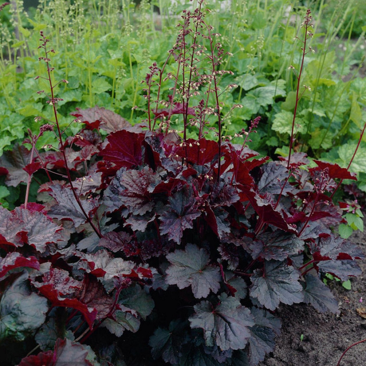 Листва растения до 25 см высотой, высота вместе с цветоносами до 50см, ширина 36-40см. Чрезвычайно эффектна на фоне зелени благодаря ярким, шоколадным с пурпурным отливом листьям. Украсит бордюр или рокарий с весны и до морозов. В середине лета появляются изящные соцветия. Морозо- и засухоустойчивое растение. Зона зимостойкости 4. Предпочитает тень или полутень.