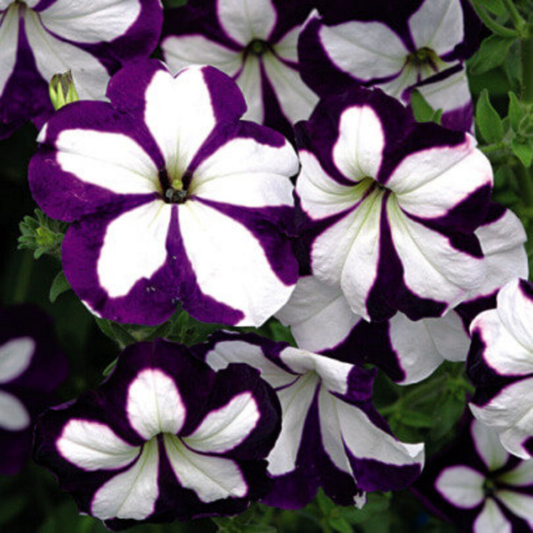 Необыкновенно красивое растение c повисающими побегами длиной до 80 см. Молодые кустики прямостоячие, вырастая, побеги свешиваются. Цветки крупные, с выразительной белой звездой на синем фоне. Цветки 7-10см в диаметре. Выращивают рассадным способом. Посев проводят с января по апрель, поверхностно, под стекло (после появления всходов стекло убирают). В зимние месяцы январь-февраль досветка обязательна. При ранних сроках посева цветение начинается в мае, что очень удобно для выращивания растений на балконе, закрытых террасах, патио. Без дополнительного освещения петунию высевают не раньше марта. Всходы появляются через 7-12 дней. На постоянное место высаживают, когда минует опасность заморозков. Светолюбива и достаточно засухоустойчива. Предпочитает легкие, плодородные, хорошо дренированные почвы. Петунии можно выращивать в течение нескольких лет, сохраняя зимой в освещенном помещении (растение сильно обрезают, t не более 12°C, умеренный полив). Прекрасно смотрятся отдельные растения петунии, высаженные в группе образуют яркое, нарядное пятно, великолепно украсят балконные ящики, вазы и подвесные кашпо.