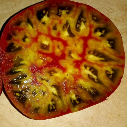 Высокорослый среднеранний сорт. Плоды крупные 500-600 гр. Внутри зеленые с розовыми и оранжевыми разводами. Мякоть мясистая, плотная с отличным сладким вкусом.