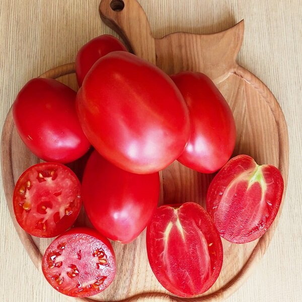 Плоды розовые, удлиненные, мясистые, с отличным вкусом, сладкие. Масса плодов 100 - 150 г. Кусты высотой до 1 м. Сорт среднеспелый, можно выращивать без пасынкования с минимальным уходом. Листья небольшие, кусты хорошо насквозь освещаются.