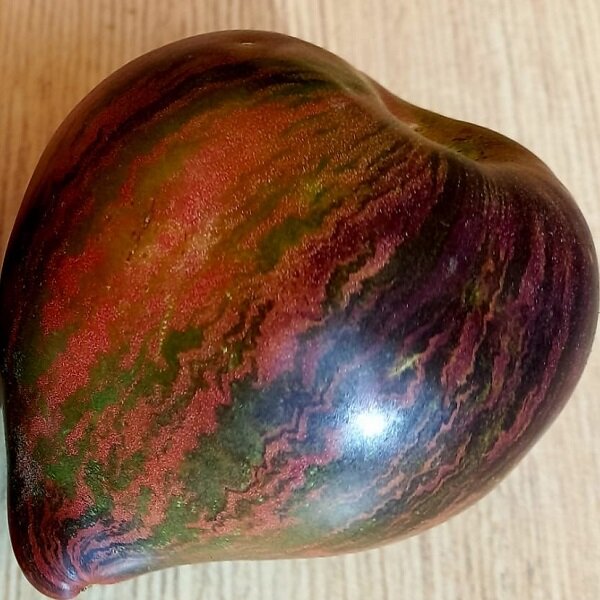 Среднеспелый, индетерминантный сорт. Вес плодов 200-300 гр. Окраска очень интересная, разноцветные замысловатые полоски и штрихи по всему плоду и с антоцианом на плечиках и бочках. Мякоть тёмно-красно-бордовая. Вкус у сорта замечательный, отлично сбалансированный с ярко выраженной сладостью и сильным классическим томатным послевкусием. Длительное плодоношение, до заморозков. Урожайность отличная даже в легком затенении. Универсального назначения. Куст высокий, с редкими свисающими листьями. В открытом грунте вырастает до 1,4 м, в теплице до 2,0 м. Требуется подвязка. Выращивать лучше в 2-3 стебля.