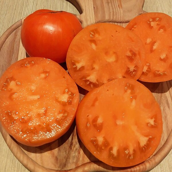 Плод от 150 до 450 гр. типа бифштекса, выпуклые и ребристые с пухлыми плечами , изогнутые. Расцветка зебра светлее красного и зеленого. Мякоть мясистая и сочная. Исключительный вкус.