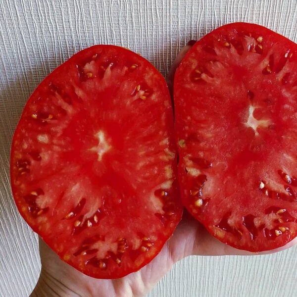 Индетерминантный, среднеспелый, очень урожайный сорт. Плоды в форме широкого сердца, ярко-красного цвета, вес плодов 200-450 грамм. Мякоть маслянистая, сладкая, вкусная. Очень вкусный салатный сорт.
