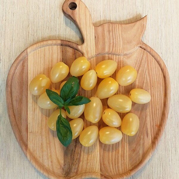 Нельзя не заметить в теплице декоративные томатные кисти из 15-20 овальных выравненных плодов массой 20-25 г, словно выточенных из белого оникса с янтарными прожилками! Вкус не менее удивителен: насыщенный и сладкий, с нотками экзотических фруктов. Индетерминантный гибрид с высотой растения а 120-150 см и средними сроками созревания подходит для выращивания в открытом и закрытом грунте.