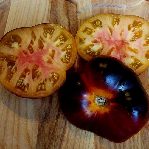 Индет., в ОГ высотой 1.5 м, лист обычный, среднего срока созревания. Плоды сердцевидно-грушевидные, в среднем от 100 до 200г. Интересный окрас плодов: оранжево-бронзовые снаружи, с темным антоцианом на плечиках и красной мякотью внутри. Мякоть плотная, сладкая, с насыщенным ароматом. Урожайный.