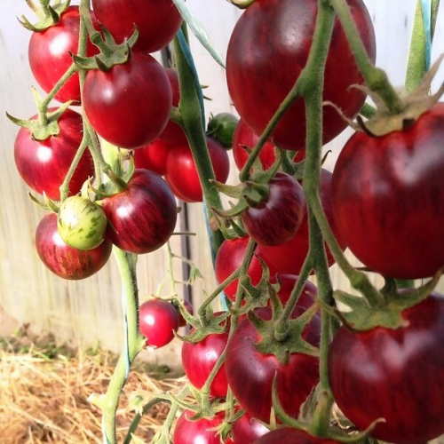 Среднеспелый, индетерминантный. Высота куста: в открытом грунте около 150 см, в теплице — около 180 см. Рекомендуется формировать в 2 ствола с обязательным пасынкованием и подвязкой. Плоды массой 50-100 грамм. Форма округлая. Цвет от розового с золотыми штрихами и фиолетовым верхом до тёмно-сливового. Вкус сладкий, насыщенный с пряным послевкусием, мякоть плотная, сочная и нежная. Используется в свежем виде и для консервирования. Благодаря форме и цвету, плоды красиво смотрятся в заготовках. Сладкая мякоть прекрасна в салатах, свежих соках, коктейлях, десертах. Они подходят для вяления на прямом солнце, в духовке или электросушилке.