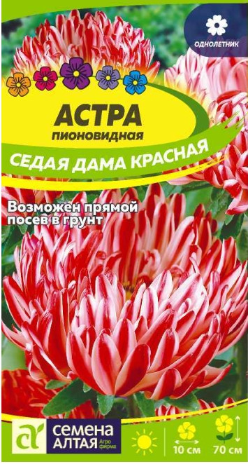 Астра Седая Дама Красная.Популярный, всеми любимый сорт однолетней астры.Куст колоновидный, стройный, высотой до 70 см. На крепких цветоносах сидят крупные махровые соцветия замечательной окраски – лепестки красные с плавным переходом к более светлым, как будто с «проседью», краям. Эта особенность выделяет сорт среди прочих, благодаря чему он неизменно привлекает внимание в декоративных садовых композициях и задаёт тон букетам. Холодостойкое, светолюбивое растение, может расти в полутени. Не выносит переувлажнения и засухи. Хорошо растет на обычной садовой почве без свежей органики, кислые почвы необходимо нейтрализовать известью.